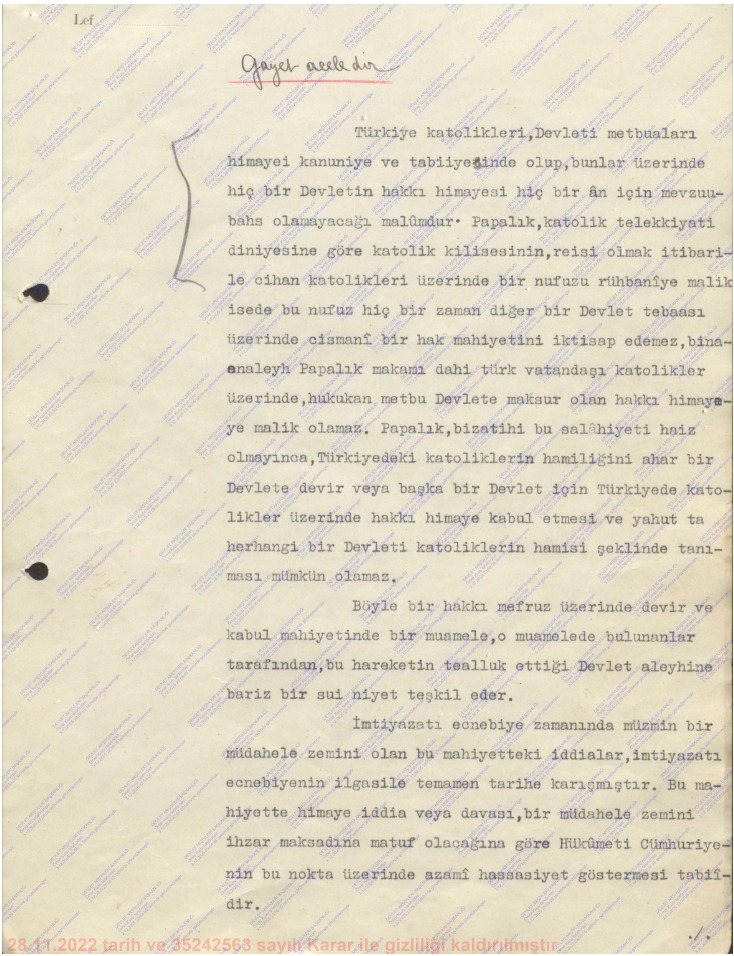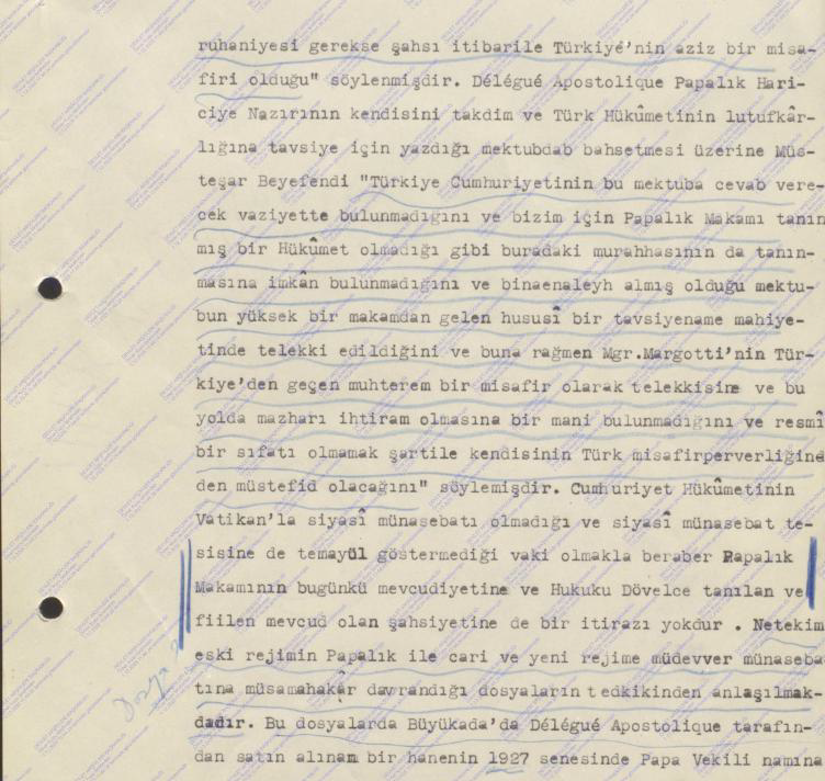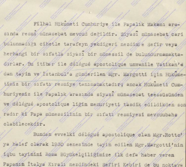 Ayrıca, Papalık tarafından İstanbul’a gönderilen Apostolik Delege Mösyö Angelo Giuseppe Margotti’nin Ankara ziyaretine dair diplomatik yazışmalarda da görüldüğü üzere (Kaynak: Türk Diplomatik Arşivi (TDA), Ülkeler, Vatikan. 28371-117087, 11.Ocak1929.) Türkiye Cumhuriyeti Papalık Makamı’nı bir devlet olarak tanımadığı için Margotti’nin “délégué apostolique” sıfatı resmen karşılık bulmamaktadır. Bu nedenle yapılan temasların tamamı “kişisel nezaket ziyareti” çerçevesinde değerlendirilmiş; diplomatik muhataplık tesis edilmemiştir.