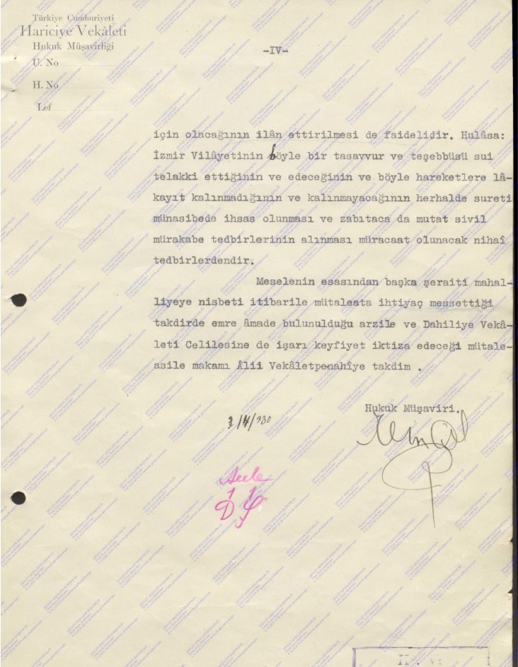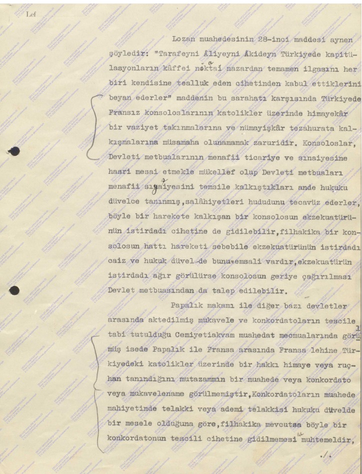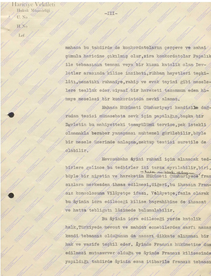 Bu gerilimin arka planını anlamak için 3 Nisan 1930 tarihli Hariciye Vekâleti Hukuk Müşavirliği’nin raporuna bakmak yeterlidir (Türk Diplomatik Arşivi (TDA), Ülkeler, Vatikan. 28371-117087, 3 Nisan 1930). Bu belge, Papalık makamının Türkiye’deki statüsüne ilişkin kapsamlı bir hukukî değerlendirmedir. Belge, bir bakanlık kararı değildir; fakat Atatürk döneminde fiilen uygulanan dış politika çizgisinin hukukî mantığını göstermesi bakımından son derece belirleyicidir.